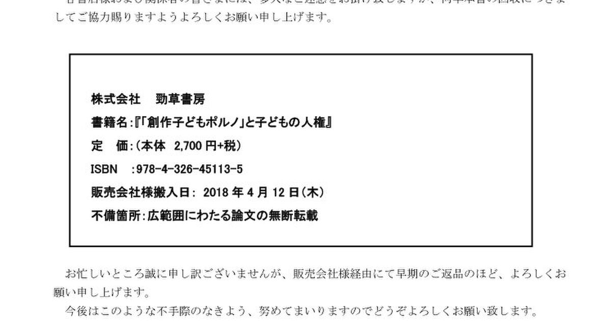 岡部拓哉 新聞マンガ研究所hp管理人 On Twitter 渡辺真由子著 創作子どもポルノ と子どもの人権 の内容に問題があり 出版社が読者から返品 返金を受け付けるとの件 出版社にとっては 普通の書店からの返本と違って 本体価格 A の金額が損益になってしまう