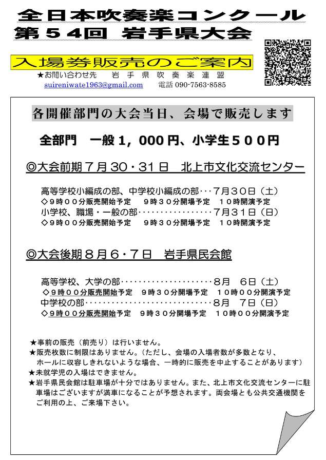 岩手県吹奏楽連盟 全日本吹奏楽コンクール第54回岩手県大会入場券販売案内