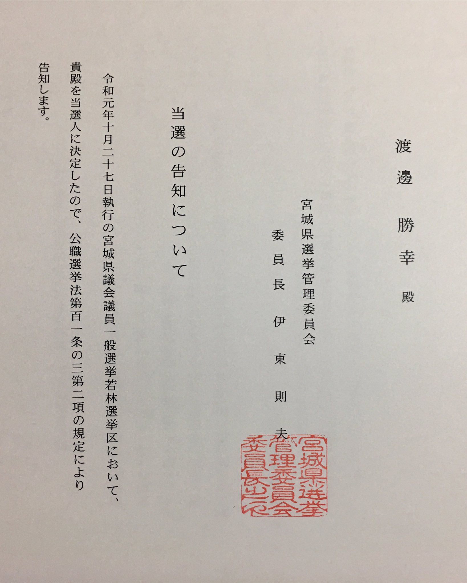 渡辺勝幸 على تويتر 宮城県議会議員選挙 当選証書授与式に出席しました 宮城県仙台合同庁舎 当選証書 当選告知書等を宮城県選挙管理委員会よりいただきました 宮城県議選2019 宮城県議選 若林区 渡辺勝幸 自民党2019 自民党青年局