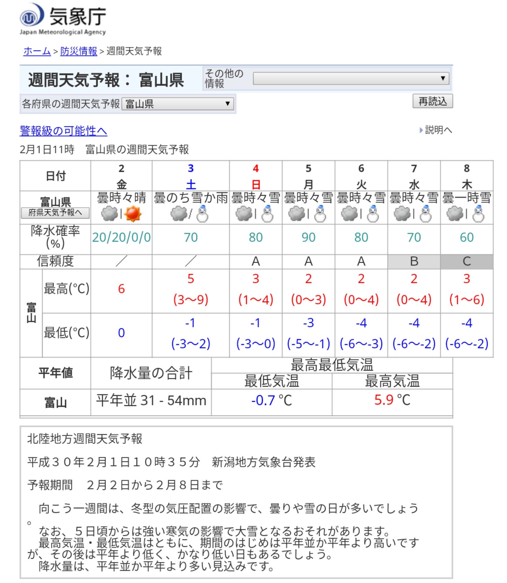 富山 圏域関連情報 情報提供随時受付 على تويتر 富山県内気象情報 気象庁が11時に発表した最新の週間天気予報 週明け5日 月 からは 強い寒気の影響で大雪となるおそれ とのこと 雪マークは節分の3日 土 から 最低気温の氷点下となる日が長く続きます