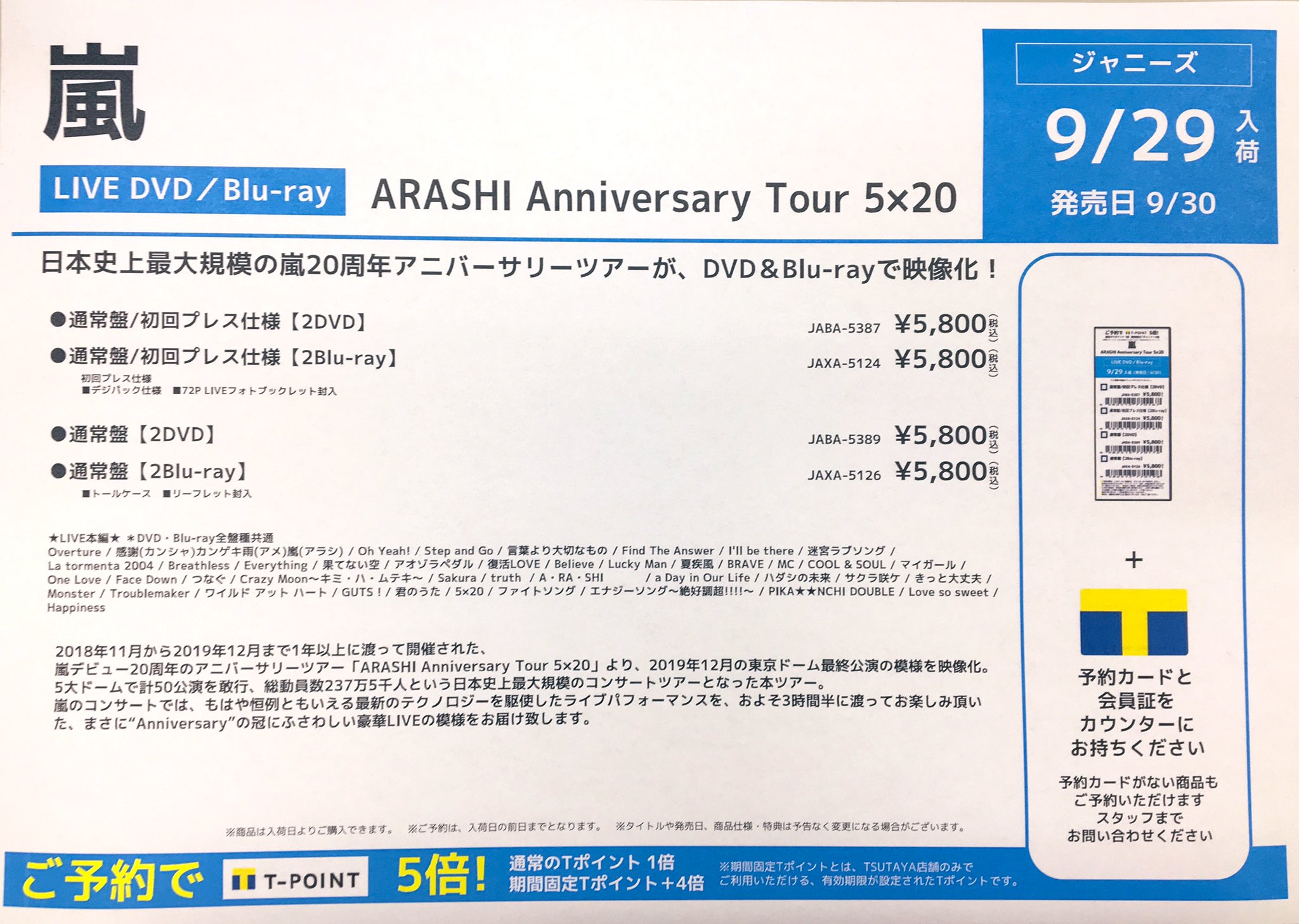 Tsutaya美里店 On Twitter Arashi Anniversary Tour 5 20 Live Dvd Blu Ray9 30 水 発売決定 初回プレス盤 72pliveフォトブックレット封入 5 273 税 通常盤 リーフレット封入 5 273 税 お電話でのご予約も受付中 0989391740 ご予約お待ちし