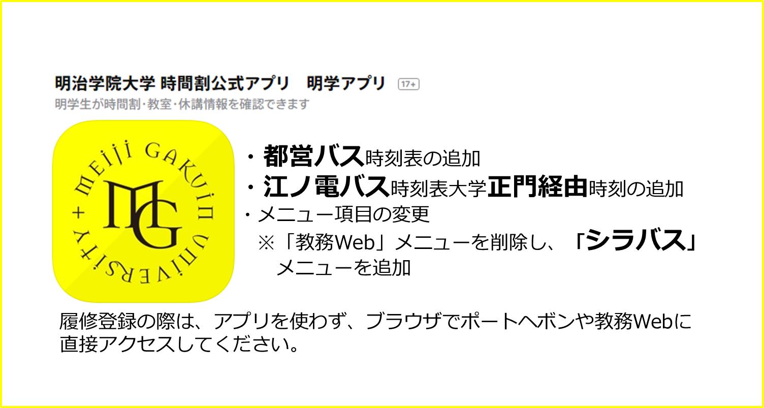 ট ইট র 明治学院大学 明学 アプリの機能追加 変更 在学生の皆さん アプリのアップデートをお願いします 秋学期科目は9 13 金 0 00から トップに表示されます わからないことがあれば 横浜教務課までお越しください アップデート Ios Https T