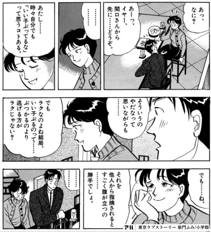 イヤー関口さんから先に どうぞ あたし 時々自分でも いい子ぶってるな って思うコトある そういうの一やだなって思いながらも でもラクなのよね結局 いい子ぶるのって ぶつかるのより逃げる方がラクじゃない でも ね 他人から指摘されるとすごく腹