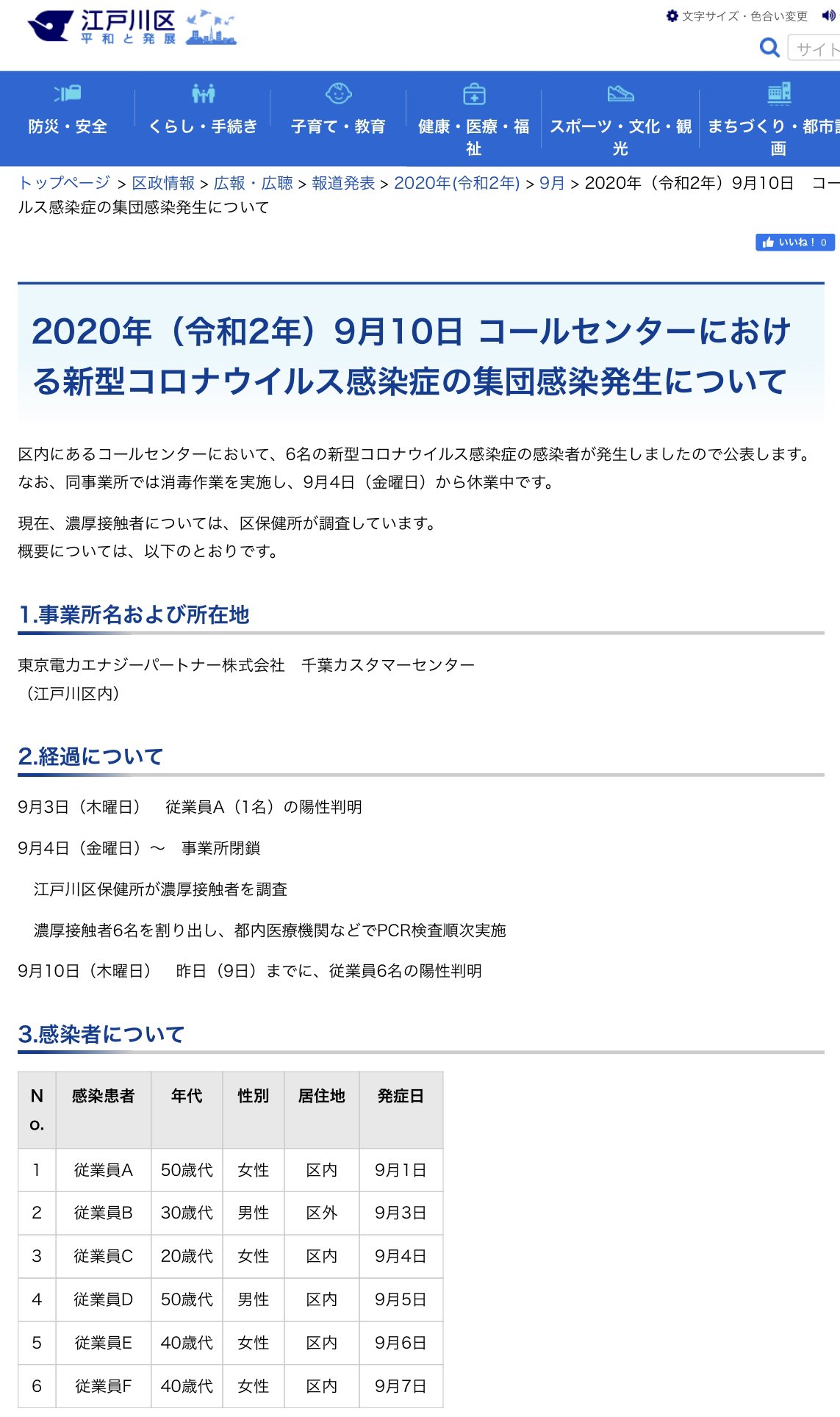 千葉防災 危機管理 V Twitter 東京電力エナジーパートナー コールセンターにおける新型コロナウイルス感染症の集団感染発生について 江戸川区内にある 千葉カスタマーセンター において 6名の新型コロナウイルス感染症の感染者が発生しましたので公表します